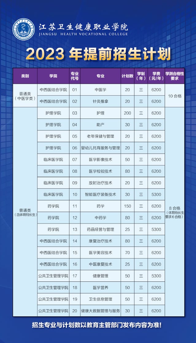 第十八条 考生须参加江苏省高校招生统一体检,并符合《普通高等学校招生体检工作指导意见》有关要求;中医学、针灸推拿、护理、助产、老年保健与管理、婴幼儿托育服务与管理、医学影像技术、医学检验技术、放射治疗技术、药学、中药学、康复治疗技术、医学美容技术、中医康复技术不招色盲、色弱者。护理、助产专业申请护士执业注册时还需符合《护士执业注册管理办法》规定的健康标准:无精神病史;无色盲、色弱、双耳听力障碍;无影响履行护理职责的疾病、残疾或者功能障碍。助产专业建议女生填报。